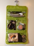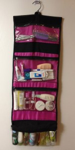 When it comes to cosmetics, that is another issue entirely. You can divide everything up and put it in ziplocs too, but, frankly, I get tired of rooting around in the bags for a particular item. By the same token, I don’t really want to unpack it all at every stop. I decided that the best compromise is to use hanging cosmetic bags — a smaller one for makeup and a larger one for everything else. In some cases, I was able to buy travel-sized products, but for other things, I purchased travel-sized containers that I could fill myself. If you haven’t figured this out already, Bed, Bath, and Beyond has by far the largest selection of travel-sized items and containers. I went crazy there. For the length of time we will be away, it was necessary to prepare a backup ziploc of some items to replenish the bags as needed. With these two bags, I can experience the ease of setting up my vanity for one night or seven by simply unrolling them and hanging them on the back of any bathroom door. Ah, you say, what if there’s no hook? Well, I have that covered too — 2 over-the-door hooks that I am also taking along.