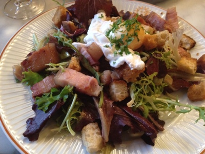 More than anything else, however, Lyon is renown for its gastronomy perhaps spurred on by chef Paul Bocuse who is considered to be the ambassador of modern French cuisine. There are two traditional dishes for which Lyon is famous — Salade Lyonnaise and Quenelles. They are typically served at bouchons — small bistros that used to serve the silk workers during Lyon’s silk producing heydays in the 1800’s. I set out to research the best (and most reasonable) place to try them out. It took a bit of time, but I eventually found Café du Soleil whose owner is reputed for producing some of the best quenelles in France and providing them to over 100 local restaurants including those of Paul Bocuse. The restaurant is located in the area of Old Lyon where ancient buildings line narrow cobblestoned streets. Small, warm, and welcoming, it is decorated in dark woods and sun-themed (soleil) paraphernalia. We ordered a menu that included a salad, main dish, and dessert for one price plus a pitchet (more or less the equivalent of a half carafe) of Beaujolais. We both chose the Salade Lyonnaise as the starter which consists of a variety of greens in a light vinaigrette accompanied by salty chunks of ham and crispy croutons and topped with a poached egg — delicious and really a meal in itself. For the main dish, we each chose a different type of quenelle — one fish and one chicken. These are large, oval-shaped dumplings made from flour, butter, eggs, and veal fat plus dried fish or chicken. They are poached and then served with a sauce similar to béchamel. At first taste, it is difficult to discern the exact flavors, but then it grows on you and becomes very “moreish”. They are extremely tasty but very filling — the best of comfort food on a cold day in Lyon as I can imagine there are many. For dessert, Norman enjoyed Île Flottante (floating island), one that is rapidly becoming his favorite — merengue floating on a vanilla custard with caramel sauce. My choice was two scoops of glacé (ice cream) — one lemon and one cassis. In the end, we were a bit stuffed but completely satisfied with an experience we could ONLY have in LYON.