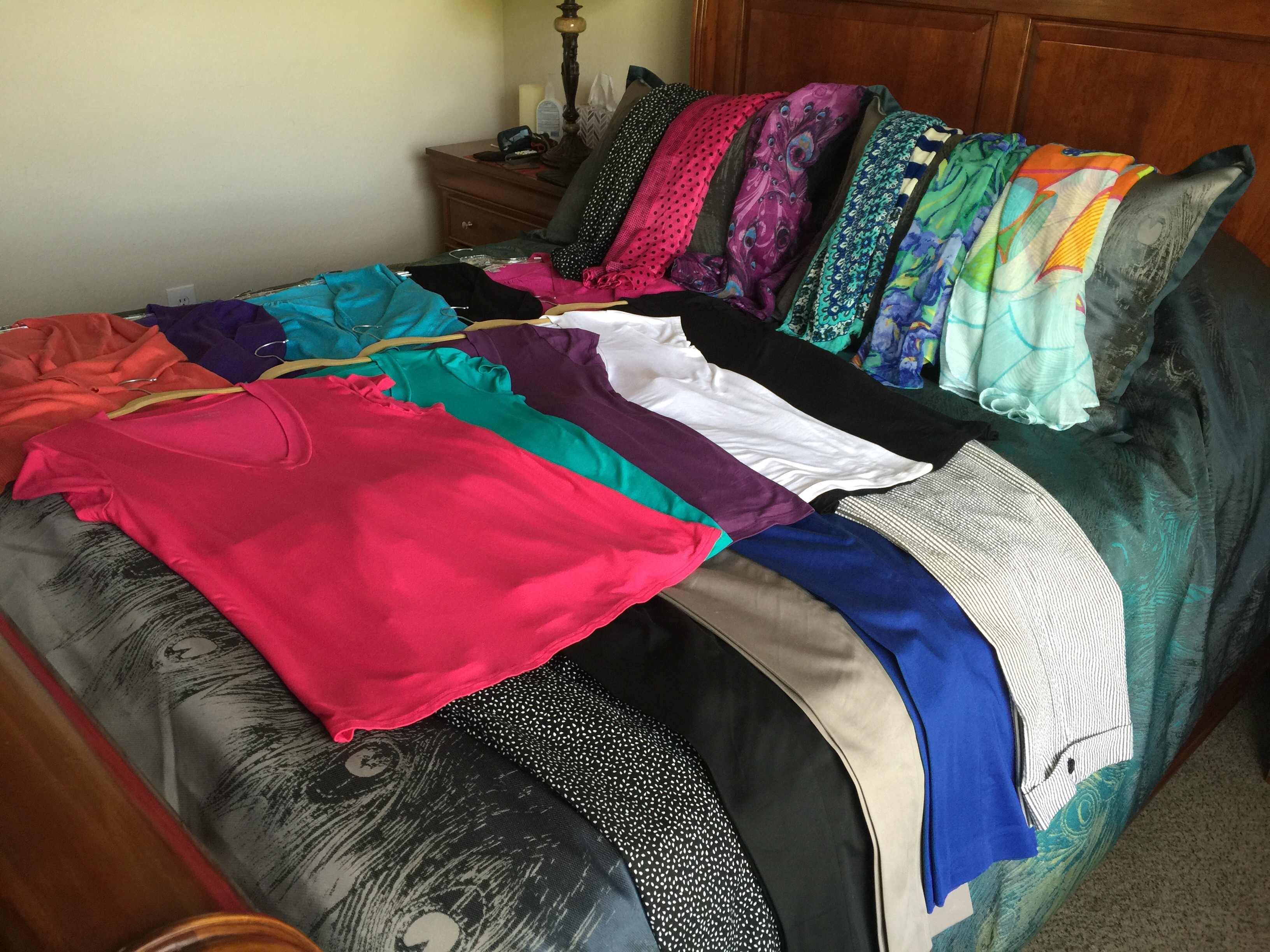 A trip to France during the summer starts out cool and perhaps wet and ends up being rather, sometimes uncomfortably, warm so it’s definitely important to layer. For me that means a couple of pairs of pants and about five pairs of crop pants all in neutral colors. Added to that will be 6-7 knit tops in solid, brighter colors plus a variety of three-quarter sleeved sweaters and last, but certainly not least, since I am going to be in France — a selection of scarves. Yes!! All items will be rolled to avoid wrinkles and most packed tightly into ziploc bags which when compressed and zipped will conserve space. In order to picture the combinations of my choices, I layed all of the potential main pieces out on the bed a few weeks ago and then photographed them so I would remember what I had settled on. I think this will work out very well and just to make sure, I will be packing two weeks in advance. That way I have time to add or delete items and take care of any last minute inspirations.