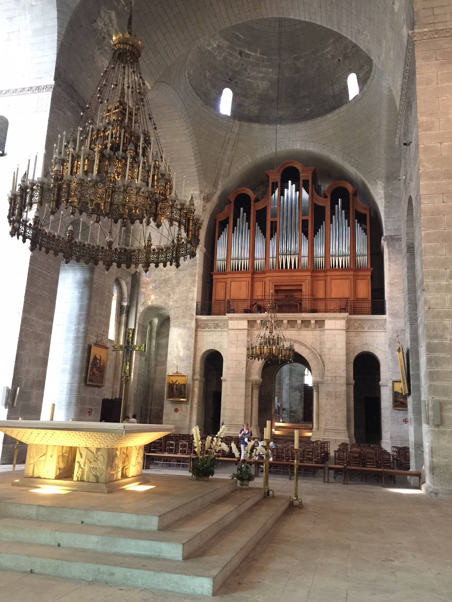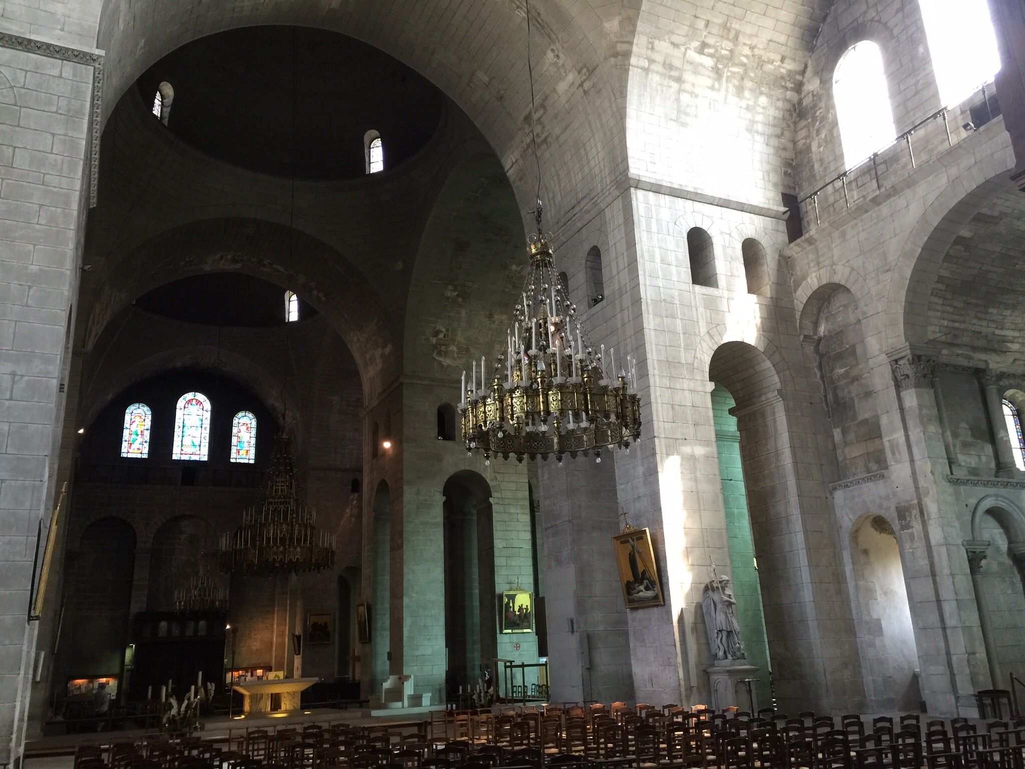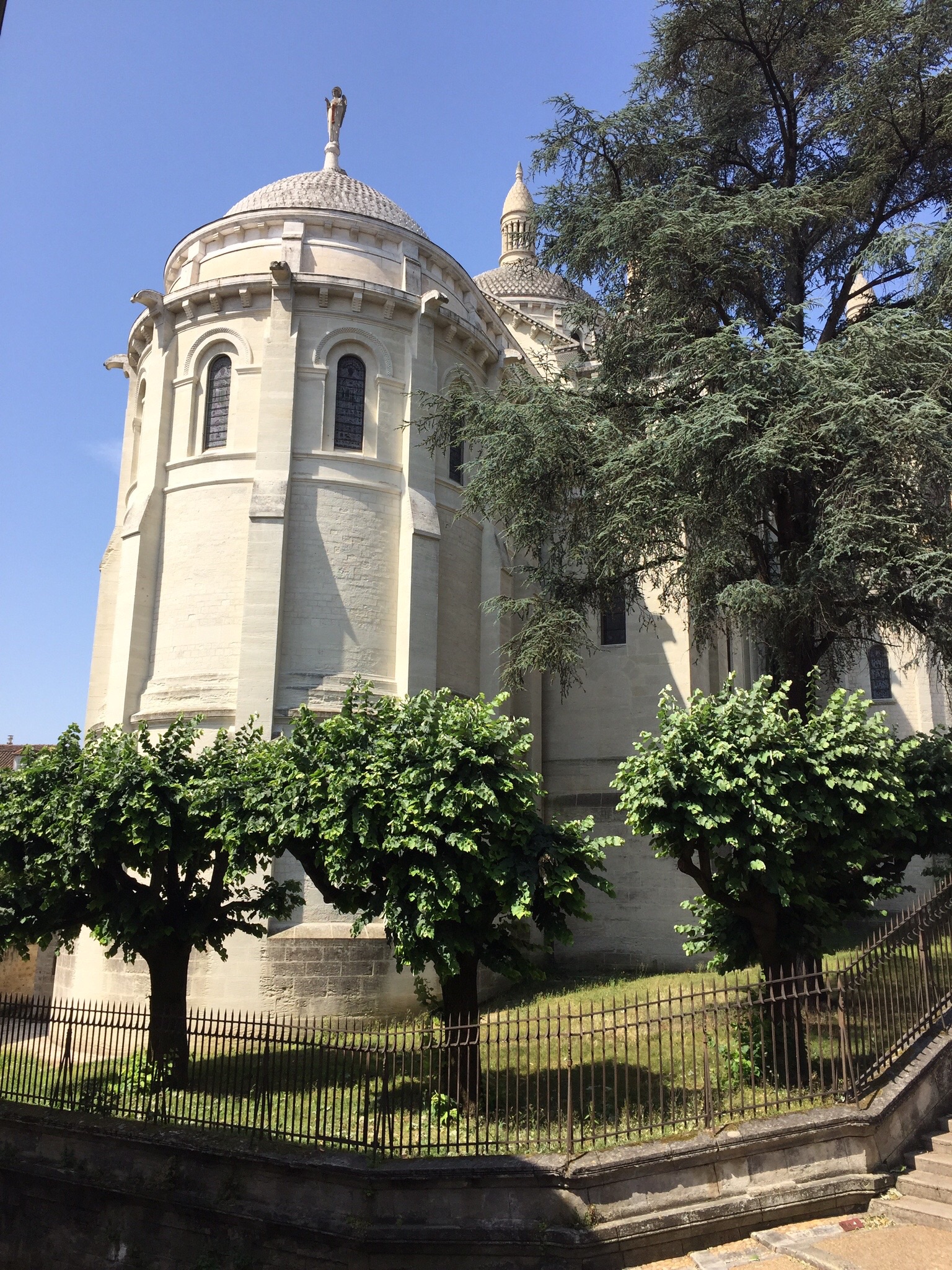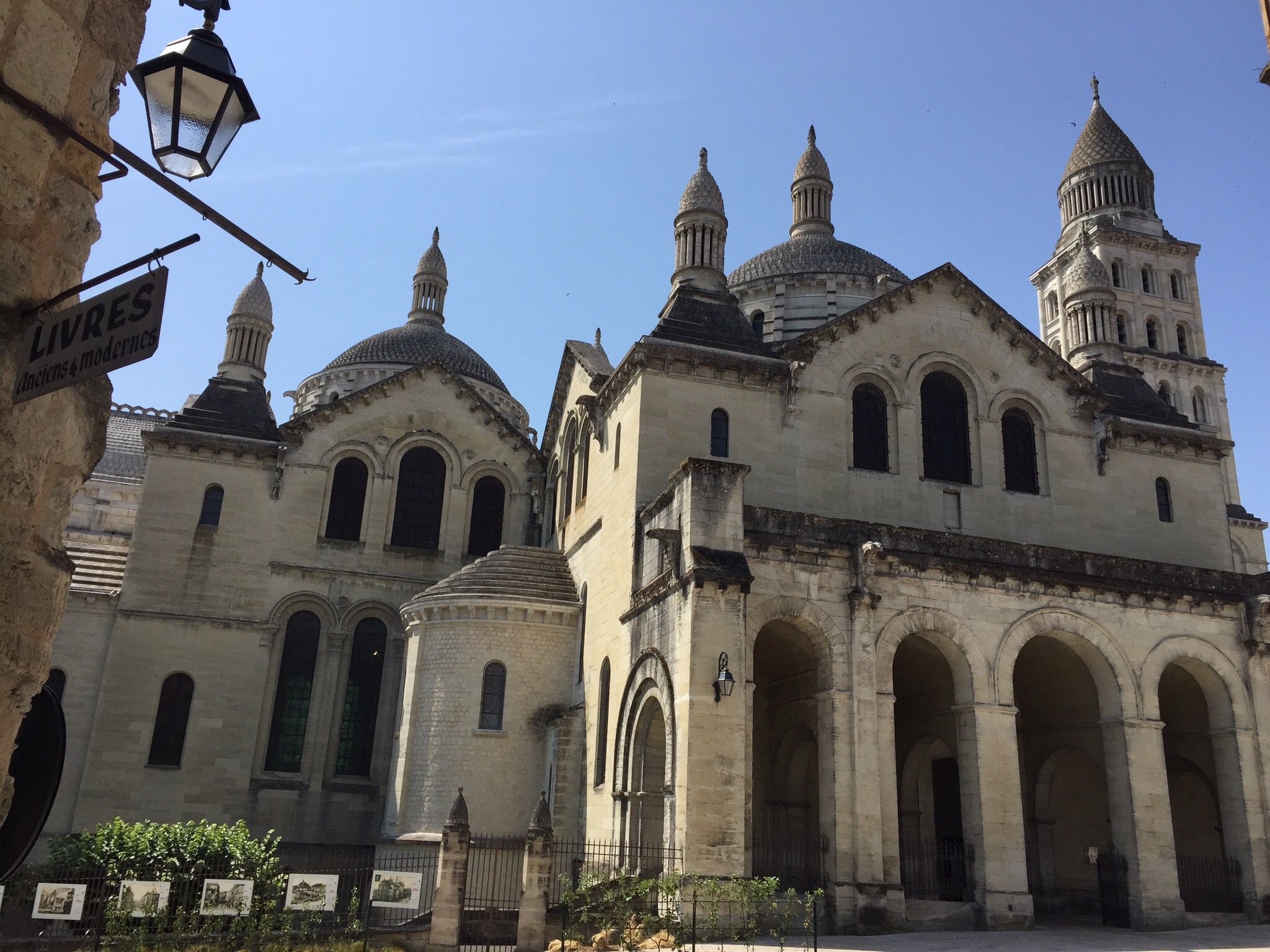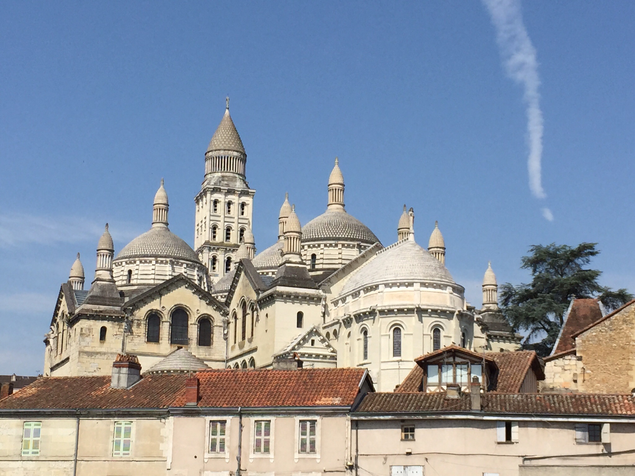Although we first visited Périgueux three years ago and only for a short time, we did stay long enough to visit the cathedral of Saint Front. This week we went to it again this time with the intention of viewing it from the the bridge that crosses the Isle River (the island). Saint Front is unique among French cathedrals in that it is capped with sixteen cupolas topped with spires. The style is clearly Roman but the scale is massive. Built on top of an 9th century monestary that burnt down (its roof was timbered), the Cathedral of Saint Front was build in the 12th century. The cathedral has undergone major architectural renovations most especially in the 1800’s.
