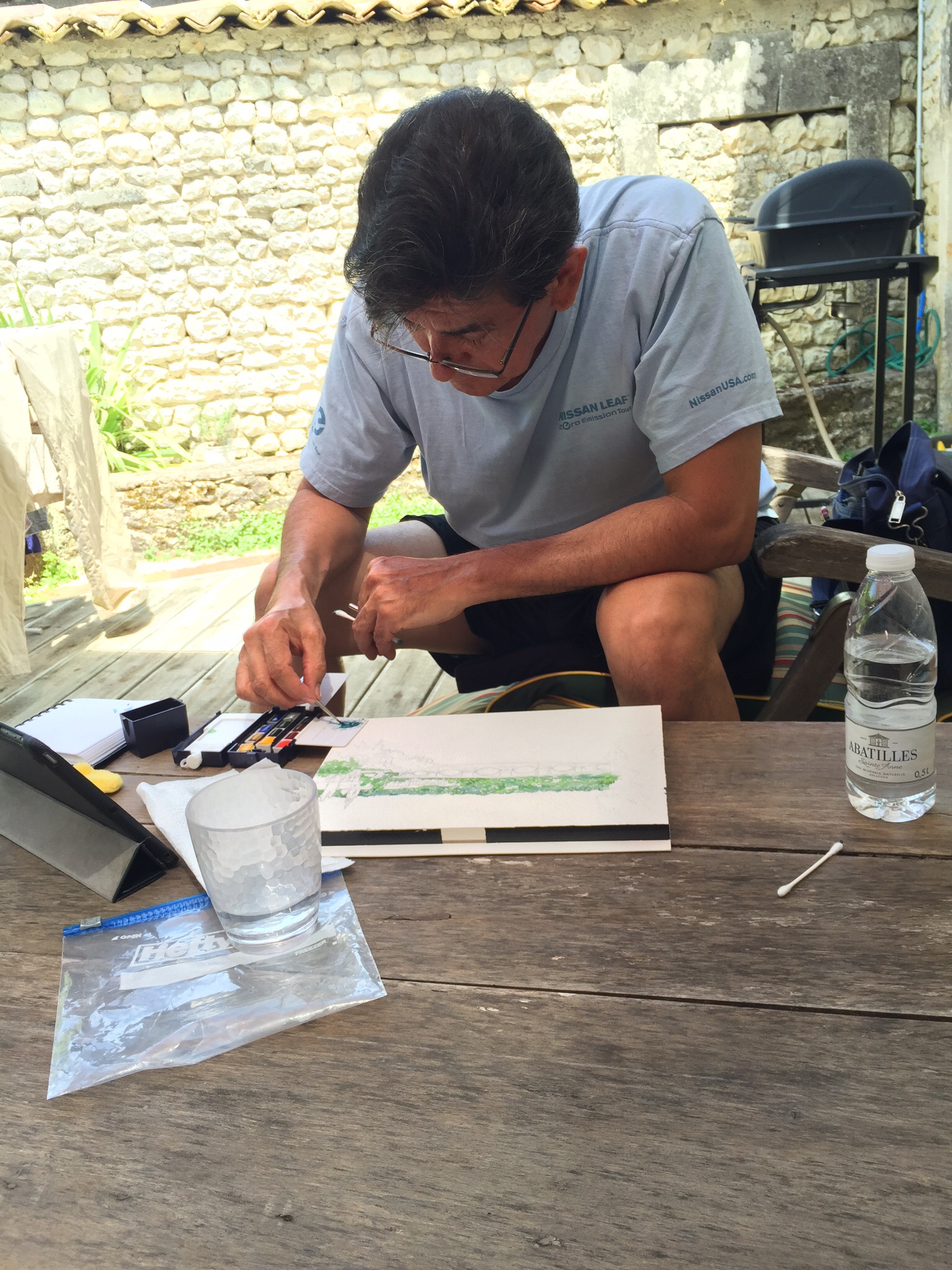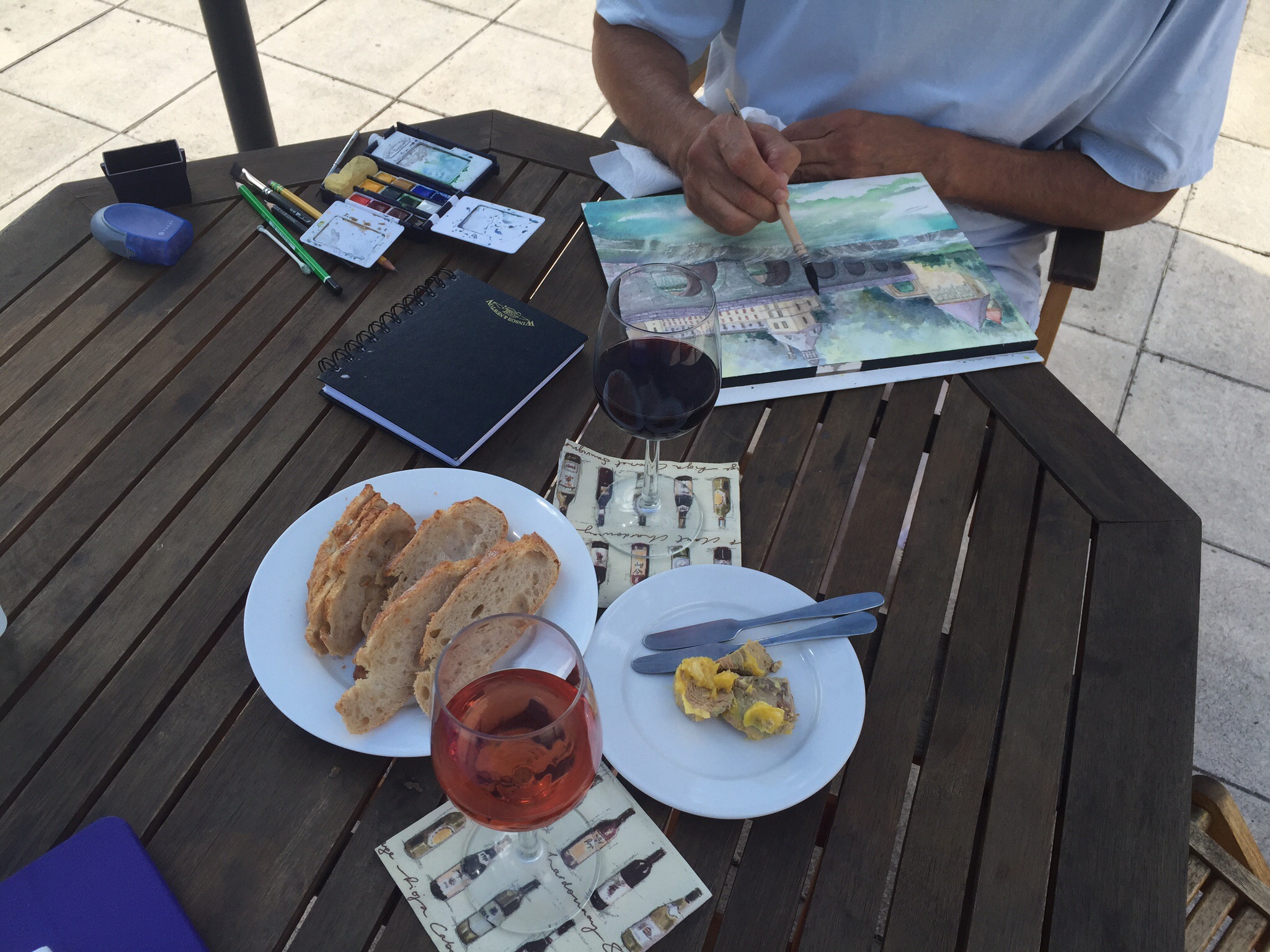 One of my greatest desires has been to see Norman take time for himself and his art. I have yearned to watch him paint or create on a regular basis. I have always wanted to see my artist at work. I have finally been rewarded on this trip to France. Norman has suddenly been inspired and has been hard at work since day one drawing and painting many of the scenes we have photographed along the way. So far he has finished 12 sketches and four watercolors which you will find in Gallery 1 and Gallery 2 of this blog. Every day he becomes more and more comfortable working in these mediums and his work flows more quickly with much more skill. It is a joy to see this finally happening and I am very happy and proud to be able to share it with everyone who follows our blog.
