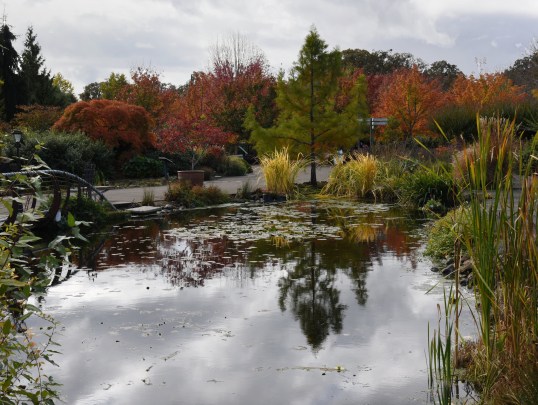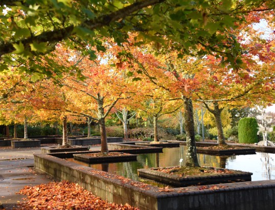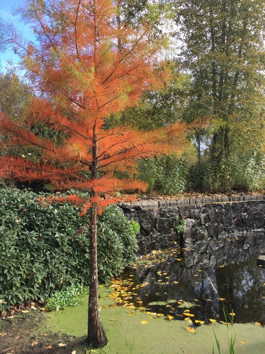 The Oregon Garden is an 80-acre botanical garden divided into 20 different specialty gardens with a focus on the flora of the Willamette Valley and Pacific Northwest. We began our tour in the large central plaza known as the Bosque (forest in Spanish) where four brick reflecting ponds surrounded by 40 Pacific Sunset Maples were resplendent in fall color. This area immediately draws you into the heart of the garden which then branches out in all directions to a variety of unique spaces. Additionally, we explored the Amazing Water Garden and the Wetlands, both combining local water treatment with the creation of a healthy habitat for plant and wildlife.