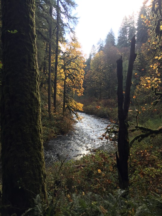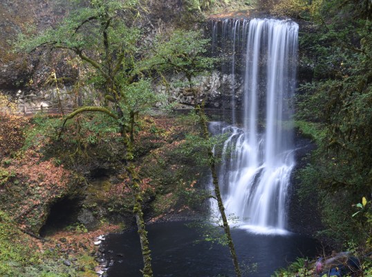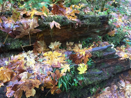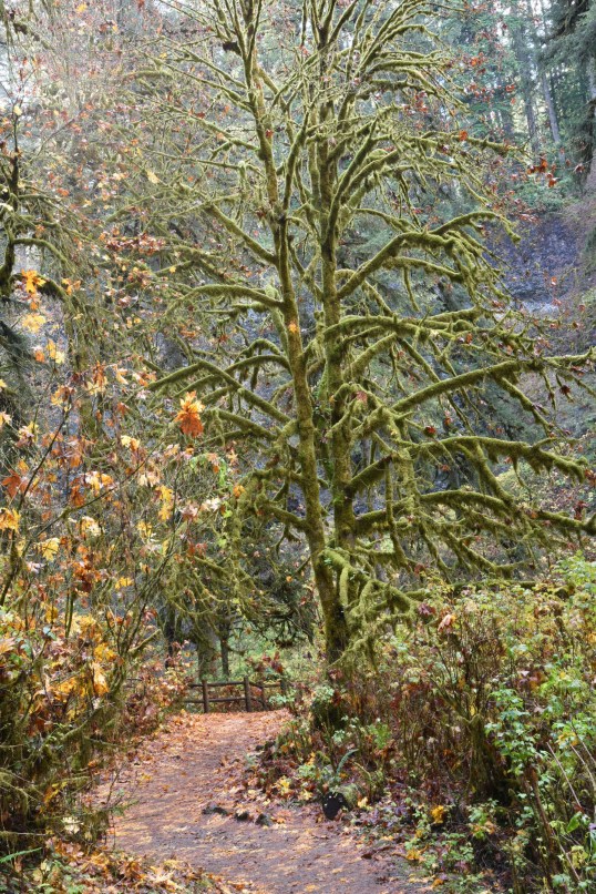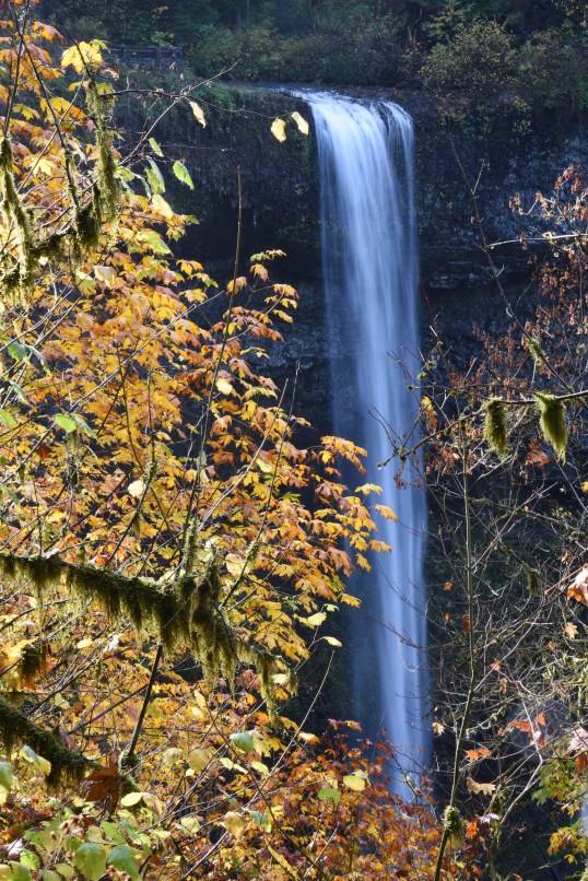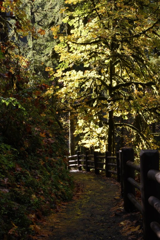 As planned, we returned to Silver Falls State Park for an autumn viewing. We were not disappointed. Our wish to capture some fall color was granted at an unlikely moment. If you have ever delved into any serious photography, you’ve learned that shooting in the middle of the day is generally not recommended as the sun is high in the sky and your subjects can turn out rather flat and uninteresting. However, there are exceptions to ever rule in photography. This day was proof of that. We arrived at our destination around 11:30 and hiked for two hours. Absolutely midday but the combination of sharply angled autumn sun and a forested canyon location was, nevertheless, perfect. We encountered many beautiful trees still bright with fall yellows, greens, and reds radiantly backlit by the sun. Here are some of the results of our efforts. We hope you enjoy them.