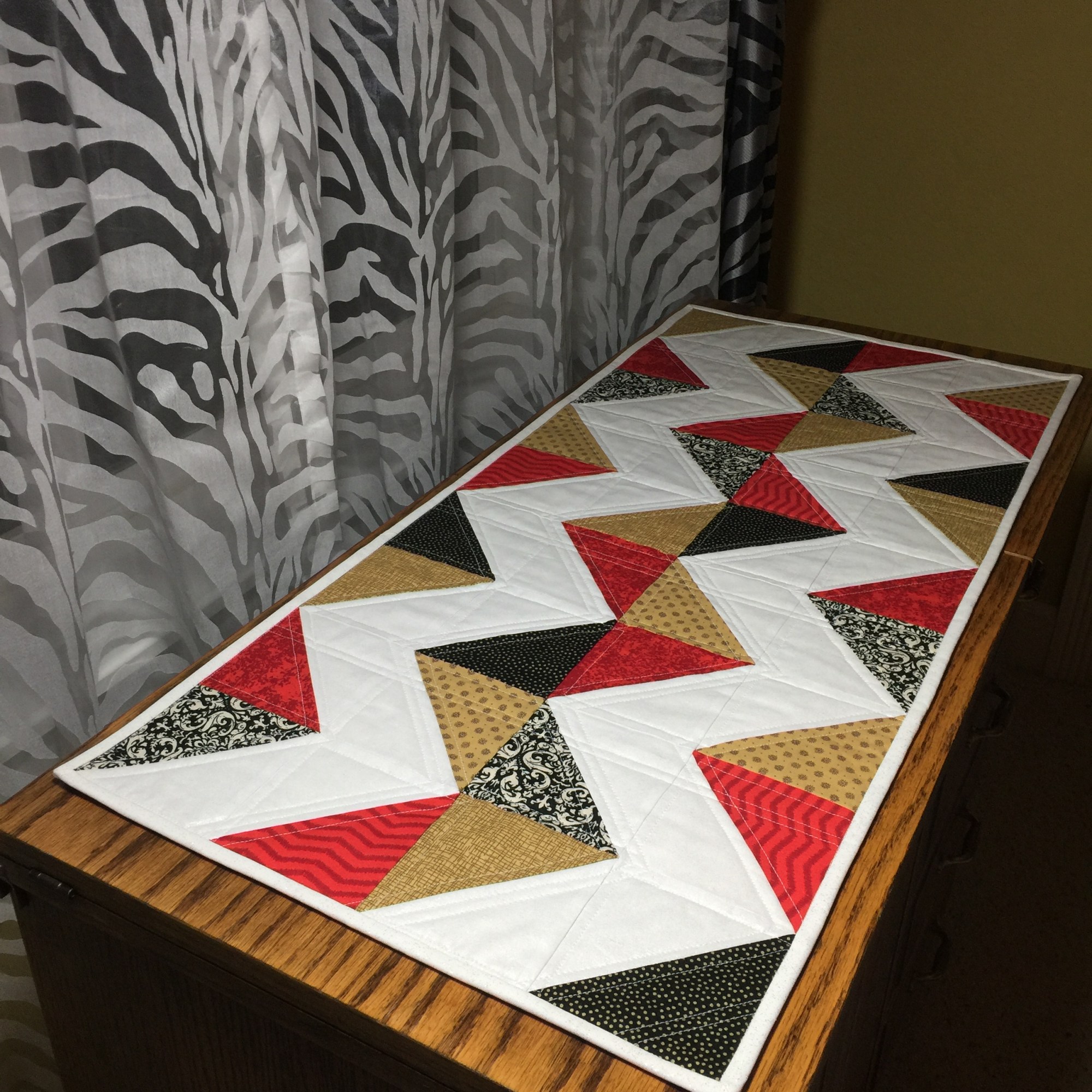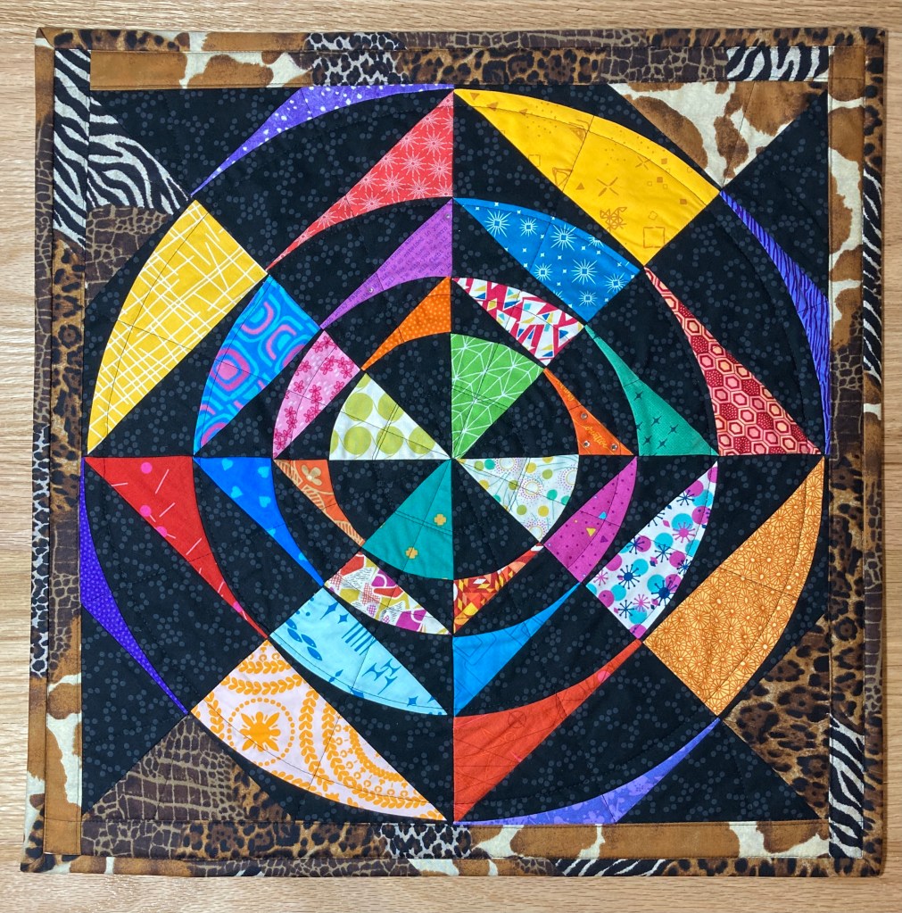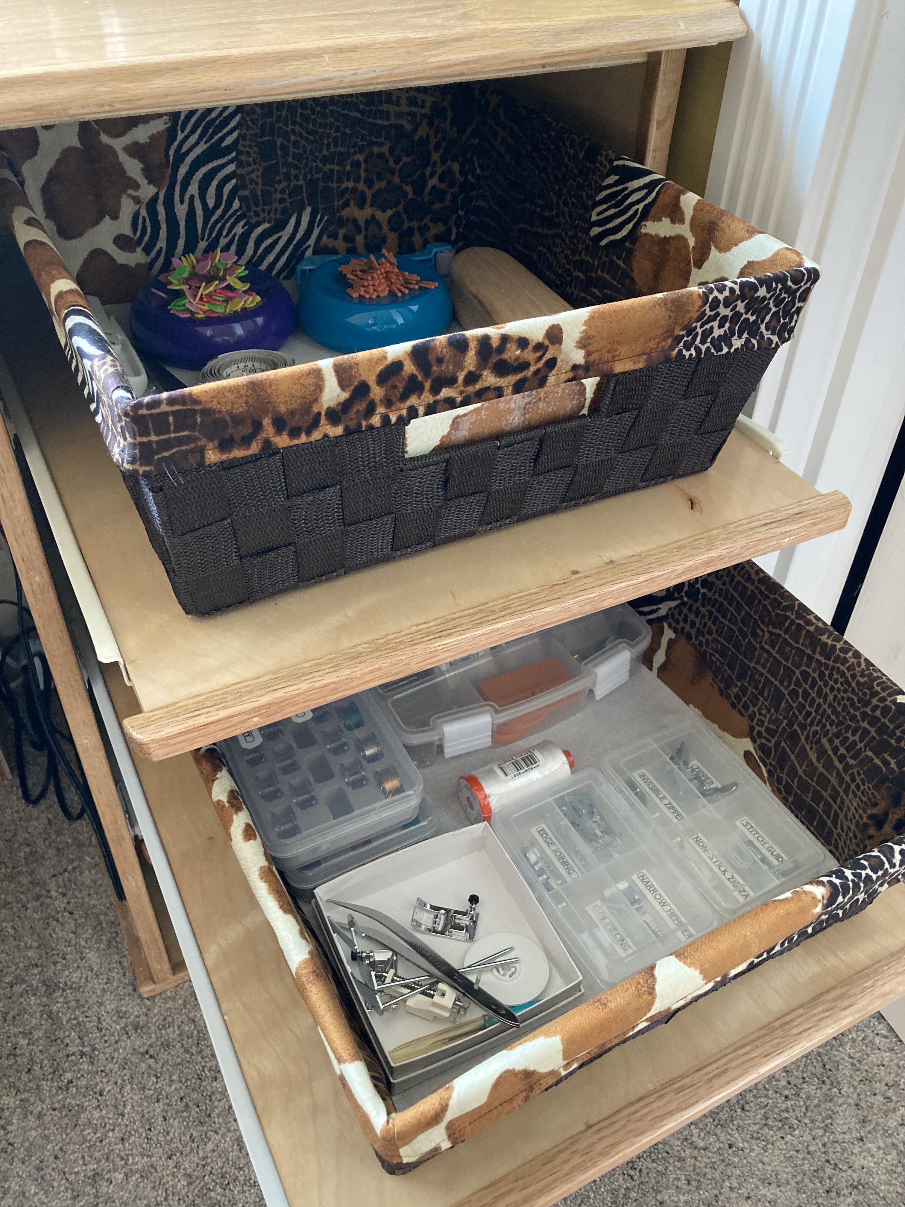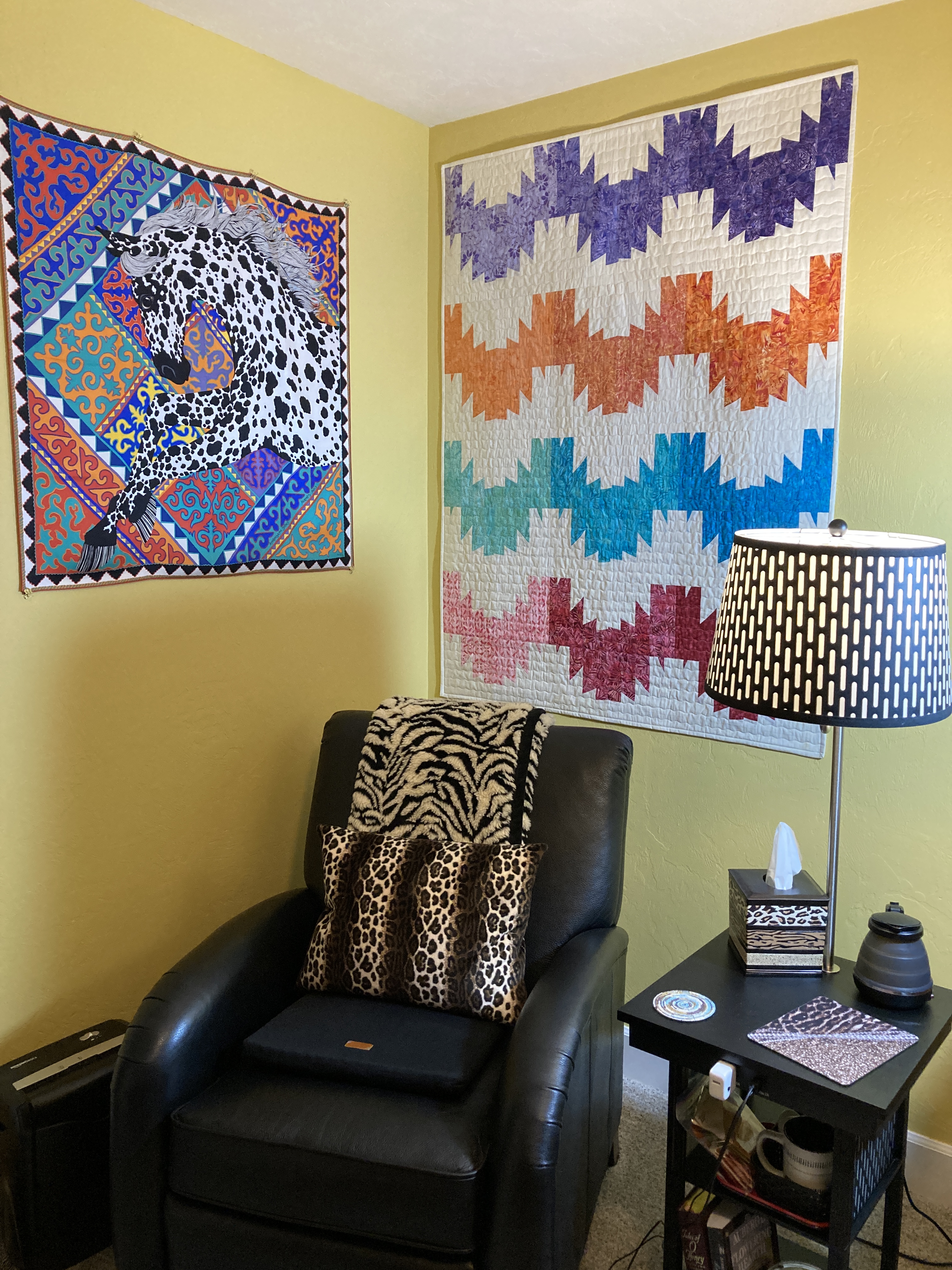 For years, my studio space has had an animal print theme. Even though I had to give up my beloved (and extremely comfortable) leopard print futon, I was able to carry on with the theme by creating “wild” basket liners to replace their original drab ones. Plus, I quilted up one of those crazy Psychedelic Blocks with some of the same fabric. I also had to shorten the curtains which I was about ready to ditch but hubby insisted I keep.