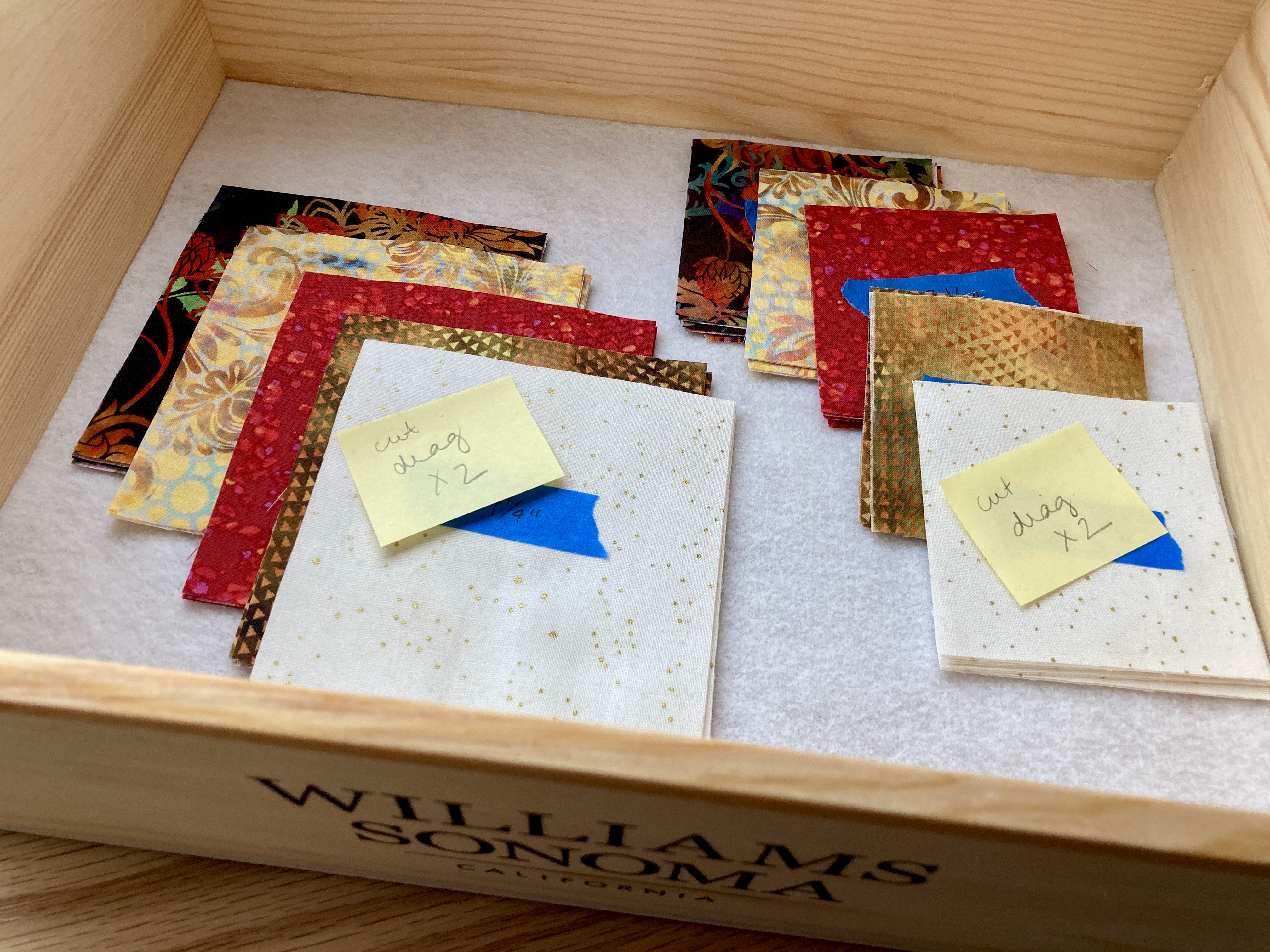Oh! Even one more repurposed thing… a beautiful wooden Williams Sonoma gift box turned project box to hold all those bits and pieces — felt-lined with felt feet added because heaven forbid I should scratch that brand-new table!