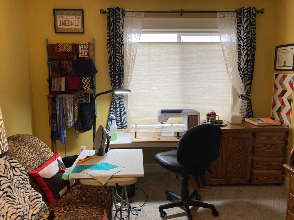 In 2006, we replaced that machine with a Brother Innovis NX-400 which seemed like quite an extravagant investment at the time compared to my previous purchase. It is housed in that wooden cabinet which has a convenient motorized lift (on the left in studio photo above). This is an item we found via Craigslist along with that comfy black recliner and the recently departed futon. Sadly, it was sitting outside on someone’s back porch. We painstakingly refinished it. I was not about to give it up… never know when you might want to have two projects going at the same time! With the new arrangement of my studio, I am happy to now be able to use it in addition to my main squeeze, the Brother Quattro 2 Innovis 6700D… also purchased through Craigslist for a deep discount. When my husband saw how serious I was about quilting, he went in search of a more appropriate machine. We had to make an 8-hour roundtrip to get it, but it literally paid off. The one piece of furniture you can barely see is a full-size antique roll top desk — yet another CL treasure. Thrilled to be repurposing so many things!