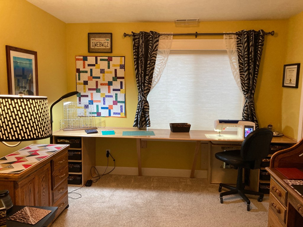 What you see here is an 11-foot wall-to-wall sewing table constructed from repurposed solid oak church pews. Hubby bought several 10-12 foot pews for $25 each knowing he could eventually reuse all the wood. He disassembled, stripped, and planed them resulting in quite a stash of lumber. Tons of work but definitely worth it. The table has a custom insert with a manual lift which allows my sewing machine to sit at three different heights — on top to facilitate cleaning or the addition of the embroidery attachment (on my list to learn for 2021), set-in for smooth sewing, and tucked away down below when I want to avail myself of the entire workspace for cutting out large projects. It also has sliding shelves at each end which I have equipped with baskets that hold all my tools and supplies. I can use them just like drawers or remove the basket entirely.
